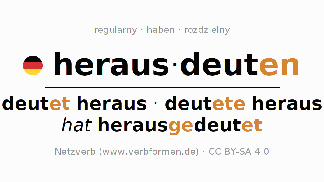 - Czas teraźniejszy: deut(e) (du) heraus, deuten wir heraus, deutet (ihr) heraus, deuten Sie heraus